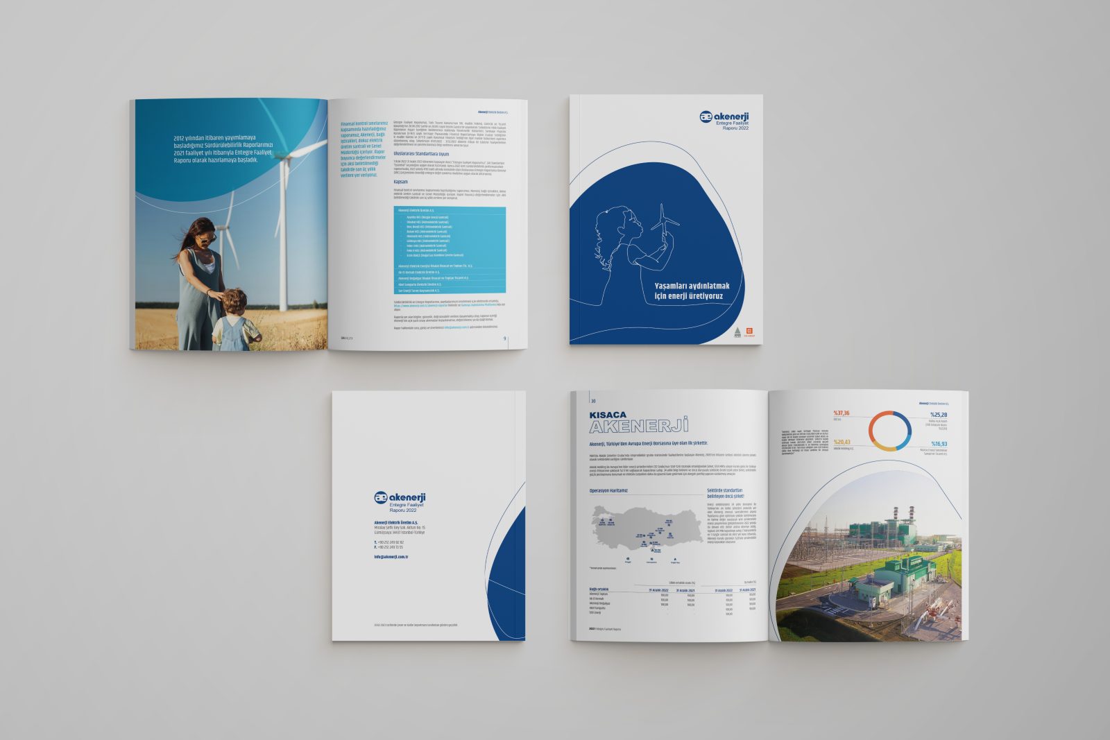 Sürdürülebilirlik ve iklim değişikliğini kontrol altına alma konusunda sahip olduğu teknoloji ve teknik uzmanlığı, faaliyetlerinin çevre ve toplum açısından taşıdığı olası riskleri en aza indirmek amacıyla kullanmayı sürdürdü. Akenerji 2022 Entegre Faaliyet Raporu’nu hazırlarken Şirketin başarıları, enerjinin hareketliliği ve çok renkliliğinden ilham aldık ve elektriğin günlük yaşamımızdaki gücüne vurgu yaparak dinamik bir görsel dünya yansıttık.