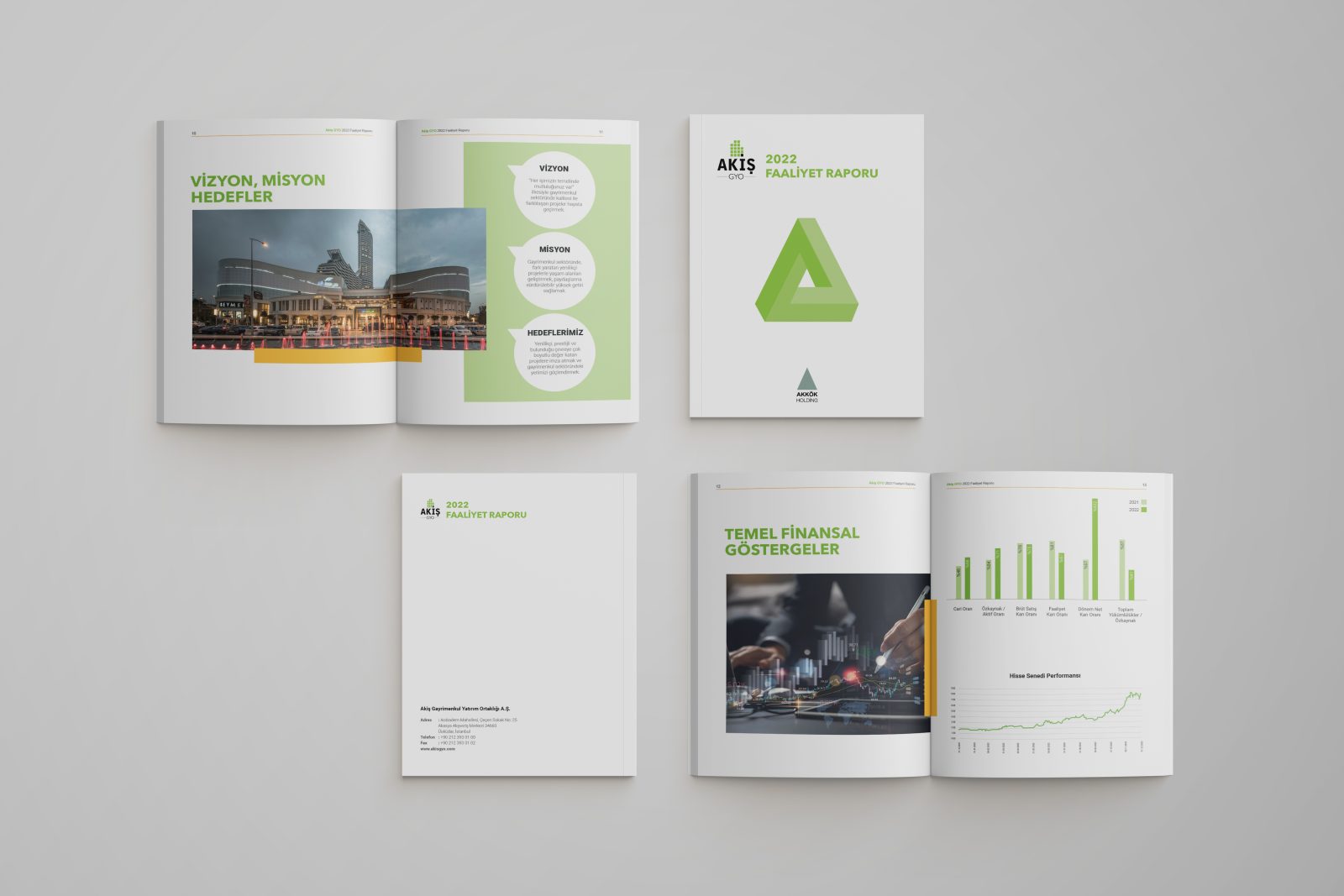 Şirketin 2022 yılına ait Faaliyet Raporu’nu oluştururken öne çıkan bilgi ve içerikleri infografiklerle desteklediğimiz bir tasarım mimarisi geliştirdik. AKİŞ GYO’nun kurumsal dünyasından beslenen bir görsel dil oluşturduk. İçeriğin dikkat çekici ve akılda kalıcı olması için grafik ögeleri, kurumsal tasarım yönergeleri ışığında bir araya getirdik.