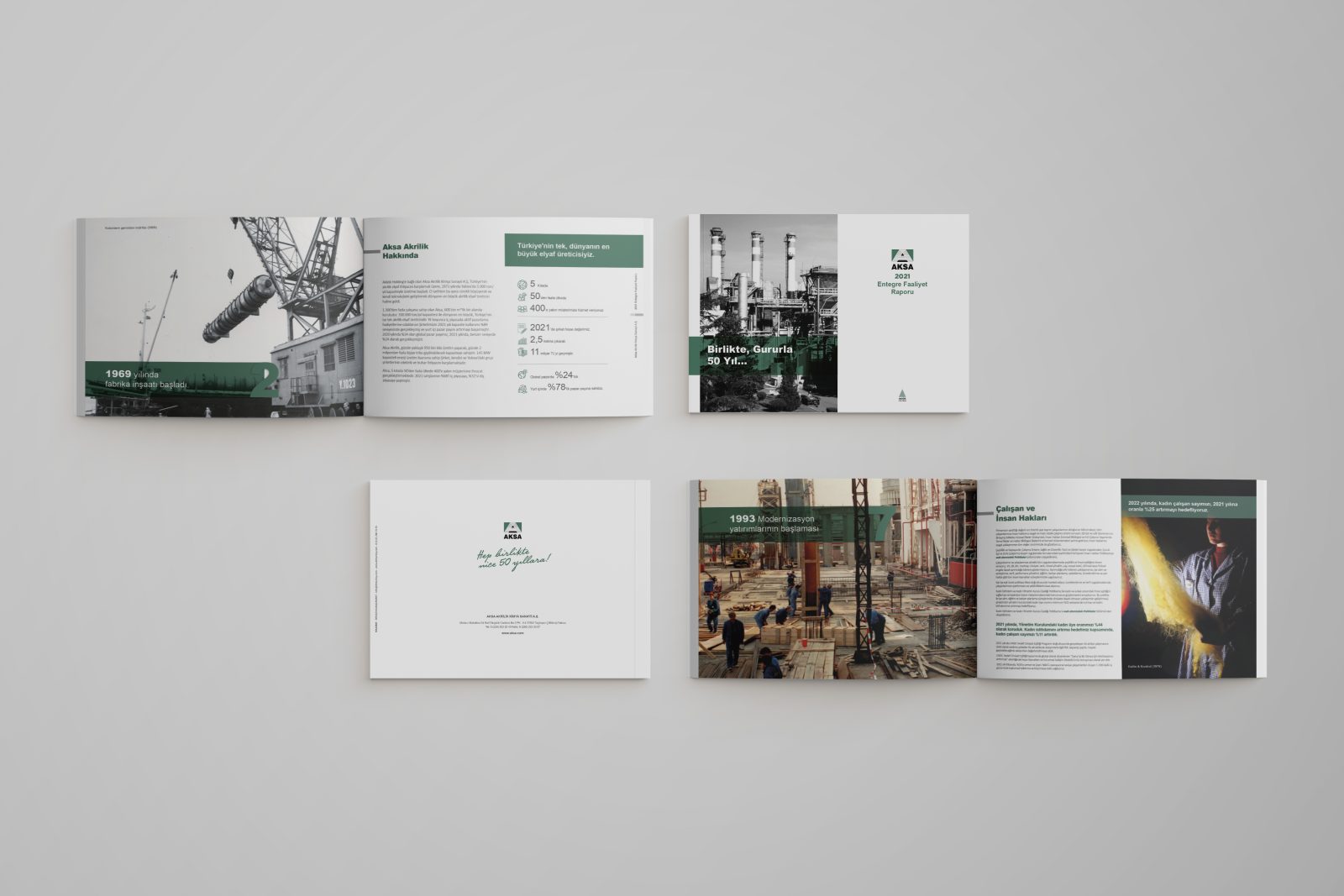 Bu tarihî ve güçlü geçmişi ön plana çıkarmaya çalışırken aynı zamanda kurumsal renk skalasını grafik ögelerle harmanladık. 50 yıllık bir Aksa albümü diyebileceğimiz Rapor’da, Şirketin başarılarını, 2021 yılının dikkat çekici gelişmelerini sayfalarımıza taşıdık.